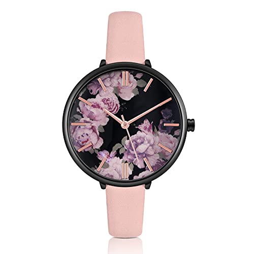 KIMOMT Women's Analog Casual Watch Floral Print Wristwatch with Pink Leather Strap