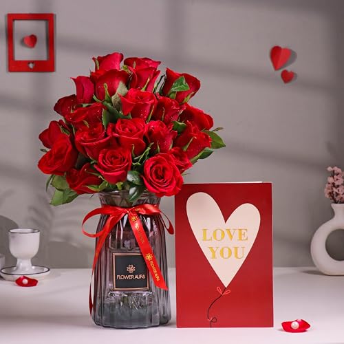 FlowerAura's decorative bunch of 20 red fresh live roses flowers bouquet in a glass vase with a love greeting card is the perfect Valentine's Day gift for your girlfriend, boyfriend, husband, or wife. The vibrant red roses symbolize love and passion, making it an ideal expression of affection. With same-day delivery, you can surprise your loved one with this beautiful and thoughtful gift, adding a touch of romance to your Valentine's Day celebration.