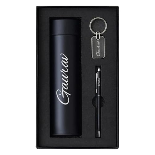 The Wallet Store Personalized Bottle Pen Keychain Gift Set | Name Engraved Stainless Steel Flask with Metal Keychain & Pen | Best for Diwali Gift, Corporate Gifting, Office, Home, Etc