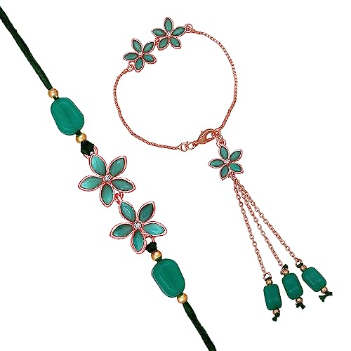 Mahi Rakhi for Brother and Bhabhi Floral Green Crystals Bracelet Style Lumba - Bhaiya Bhabhi Rakhi Set (RCOL1105520ZGre)