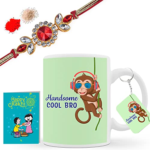 Kaameri Bazaar Rakhi Gift for Brother | Rakhi with Ceramic Coffe Mug, Roli Chawal Pack, Keychain and Greeting Card - Handsome Cool Bro