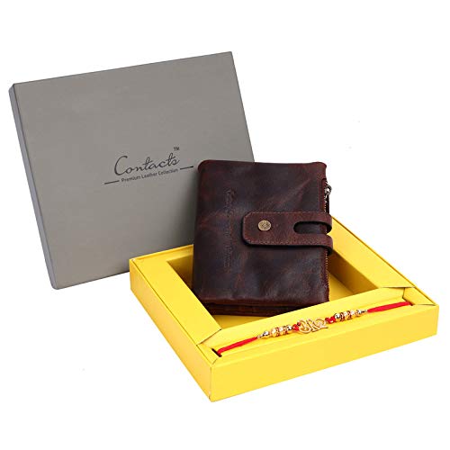 Contacts Men's Genuine Leather Wallet with Rakhi Gift Set Combo | RFID Blocking Wallet for Men| 14 Card Slots, 1 ID Window | 2 Zipper Compartments, Button Closure (Brown RKI)……