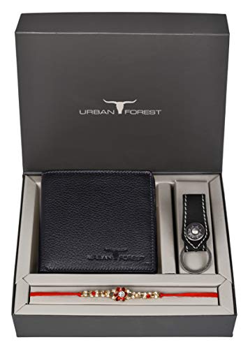 URBAN FOREST Rakhi Gift Hamper for Brother - Classic Black Men's Leather Wallet, Black Keyring and Rakhi Combo Gift Set for Brother - 4558