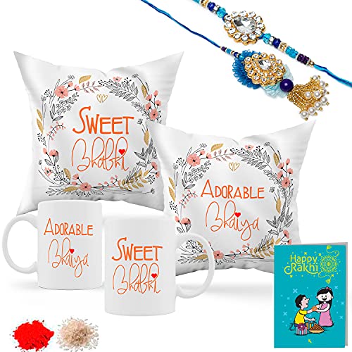 Kaameri Bazaar Rakhi Gift for Brother and Bhabhi- Adorable bhaiya bhabhi Quote 2 Printed Cushion Cover with Filler, 2 Mugs, Rakhi and Lumba, Roli Pack, Greeting Card - Rakha Bandhan