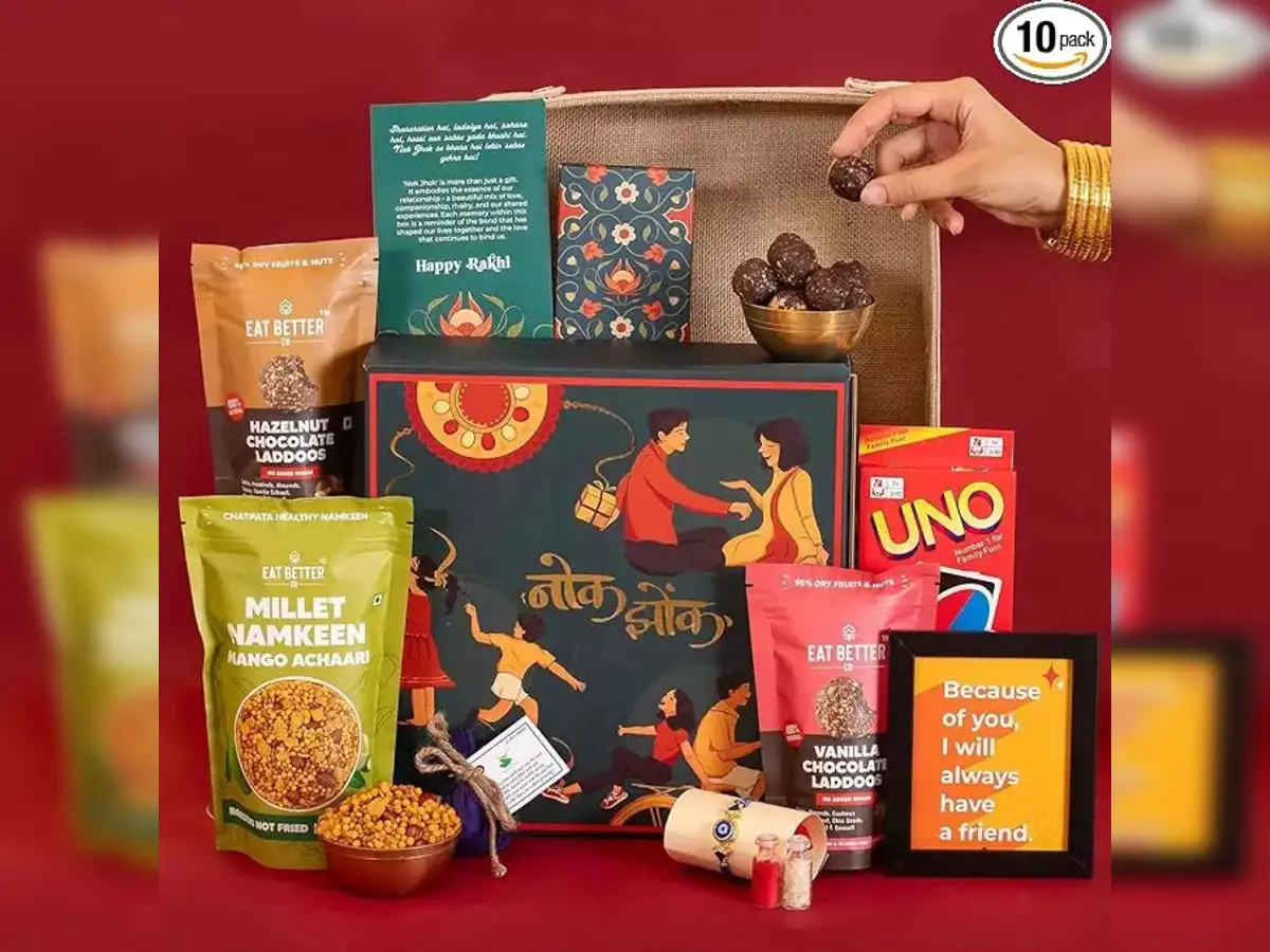 Buy NowCelebrate Raksha Bandhan with the Nok Jhok 10-Item Sustainable Jute Tray Rakhi Gift Hamper by EAT BETTER CO. This thoughtful vegetarian hamper, beautifully presented in a hardcover story-box, includes an evil eye Rakhi, roli-chawal, hazelnut-chocolate laddoos, healthy millet mixture, and more.