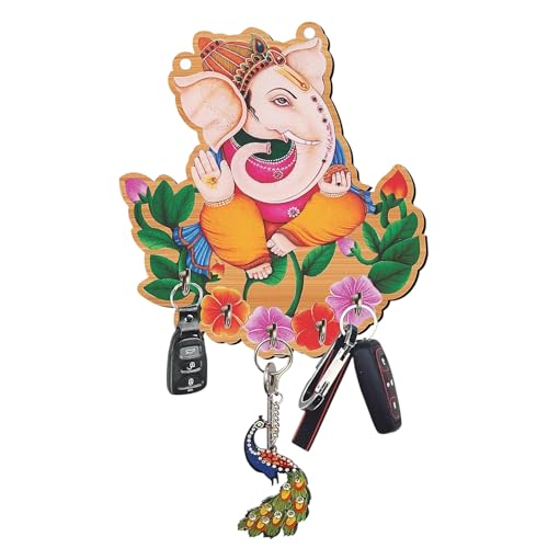 Crafts World CW Ganesha Wooden Wall Key Holder with 6 Stainless Steel Hooks | Decorative Key Hanger for Home Entrance, Living Room, Office | Wall Mounted Key Stand Organizer