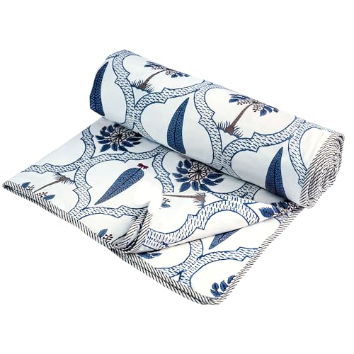 Indigo & Poppy Home Linen 100% Cotton Reversible Dohar TC - 240 Double Bed Size | Jaipuri Printed Artisan Block Design Blanket | Lightweight Ac Comforter Quilt (88"x88", Nargis), Electric Blue