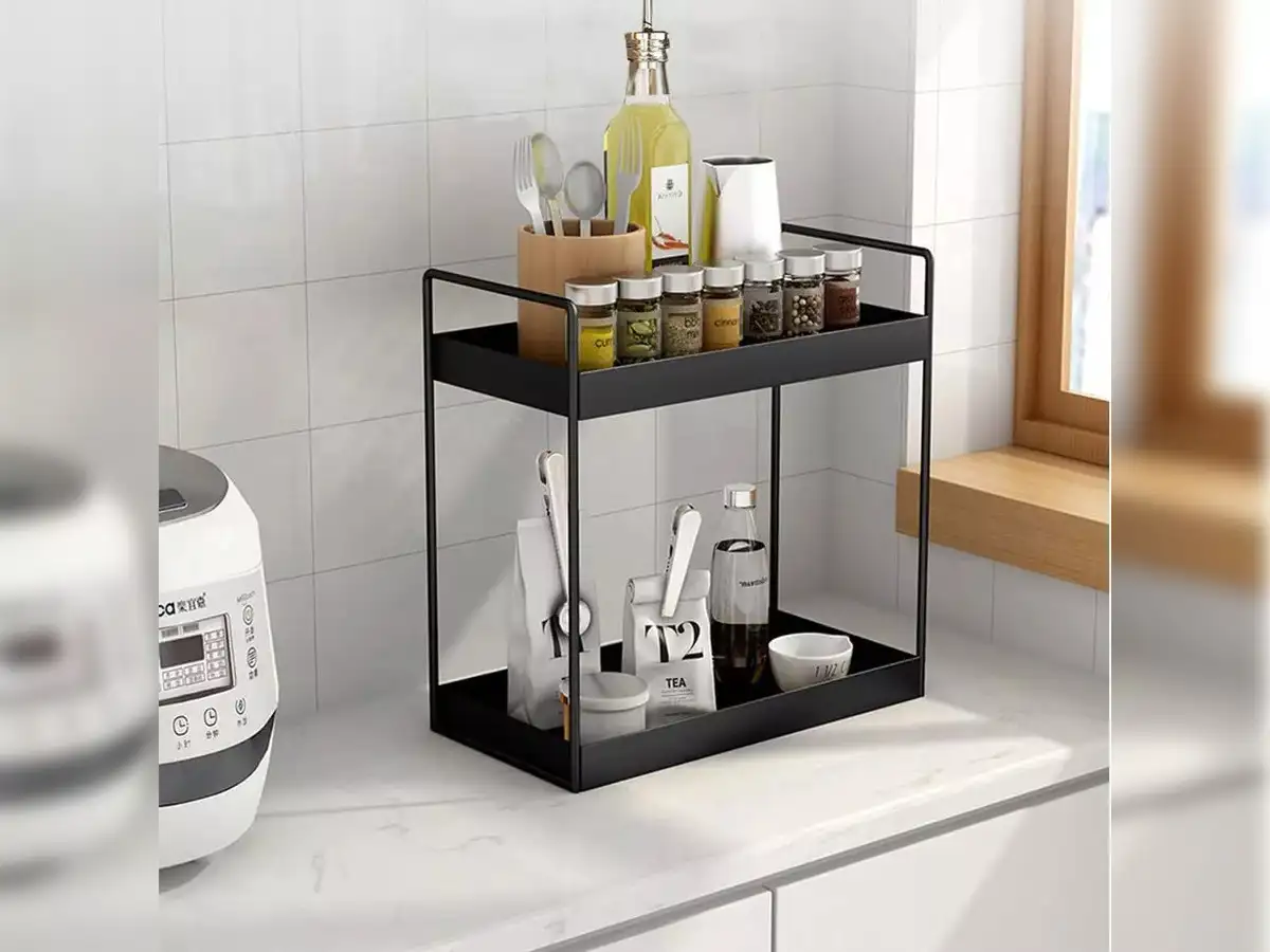 Recommended by Amazon itself, AB99 COLLECTION Countertop Shelf is the solution to all your kitchen storage woes. This two-tiered shelf comprises sturdy metal pipes that offer a wide area to keep all your daily essentials like ghee, tea, sugar, spices and oil. You can also use this shelf to keep fruits, vegetables and utensils as it comes with high sturdiness.Features-
