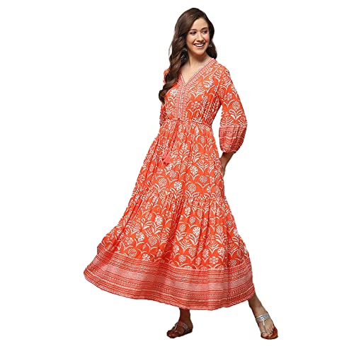 Radiate elegance in the BIBA Women's Dress, which combines style and comfort. Crafted from Rayon, this knee-length dress in a vivid Orange hue has a classic V-neck and 3/4 sleeves, offering a great balance of modern and traditional aesthetics. The floral design contributes to its beauty, and the weary fit gives it a modern touch. Made in India, this outfit reflects ethnic diversity and demonstrates a distinct sense of style. Elevate your wardrobe with this printed combination, suitable for a variety of events where elegance meets refinement.