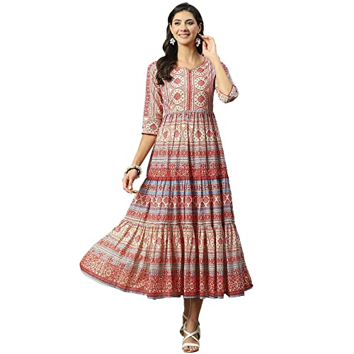This charming dress by Miss Chase features a charming floral pattern, complemented by half sleeves and a relaxed fit. Styled in a tiered design with an ankle-length hem and a flattering V-neck, this versatile piece is suitable for various occasions, including party wear, casual outings and daily wear.