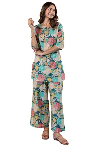 It features matching pants with similar printed work and a round neck style. Its fabric is very comfortable, ensuring ease of wearing and style during summer. Overall, a great casual wear dress for women.