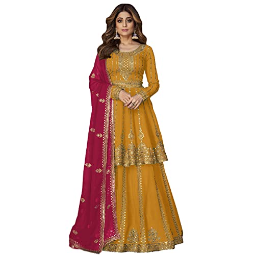 SHAFNUFAB Women's Georgette Semi Stitched Pakistani Salwar Suit (SF171434 Yellow Free Size)