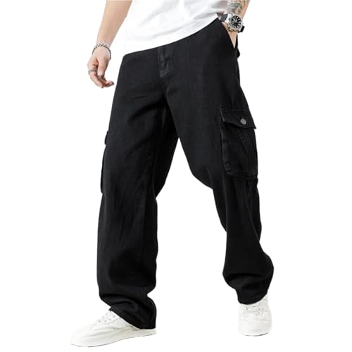 Bwolves Men's Casual Black Solid Denim Baggy Cargo Jeans l Relaxed Fit 6 Pockets Button Closure l Sizes 38