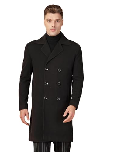 CHKOKKO Men Formal Long Winter Coat Double Breasted | Thigh Length Overcoat Featuring a Notched Lapel Collar and Convenient Front Side Pockets for Stylish Wear Black L