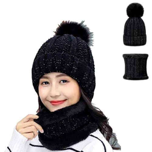 Handcuffs Women Winter Knitted Warm Beanie Hat with Scarf, Ear Protection Pompom Woolen Hat for Adult 2PCS Set (Black)