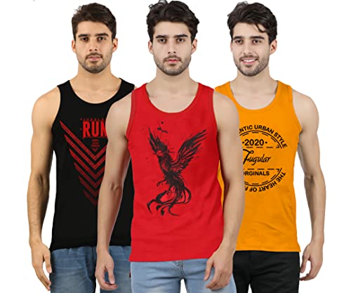 JUGULAR Men's Cotton Sleeveless Regular Fit Vest Combo - Pack Of 3 (Ninety Seven, Ncity, Skull, Medium, Black, Red, Mustard)