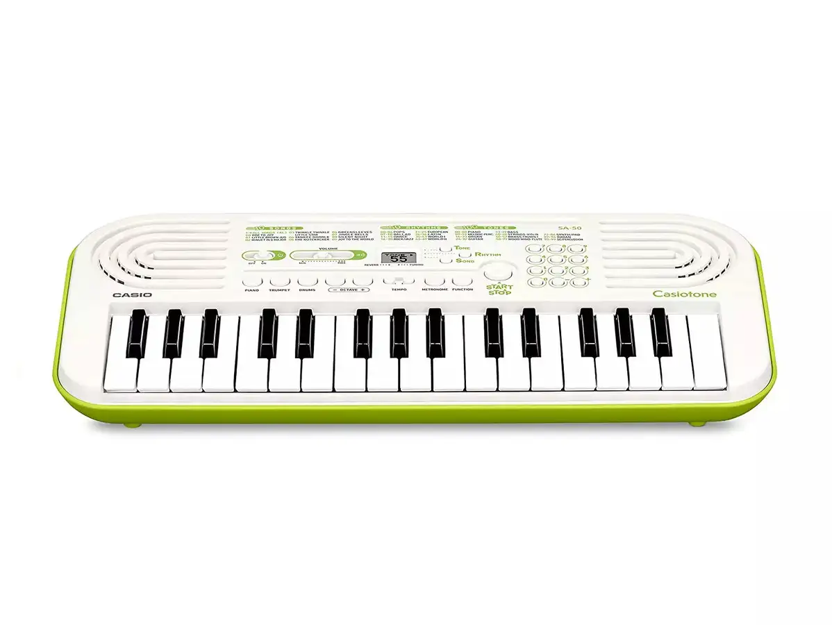 This is an ideal option for your first keyboard. Even with small hands, playing is made simple by the 32 mini keys and the polyphony of 32 notes It has 50 rhythm patterns that are used in pop, ballads, dance, and other genres. This piano keyboard can play various instruments, including piano, wind, percussion, and many others, all sampled from real acoustic instruments, thanks to its 100 high-quality built-in tones.