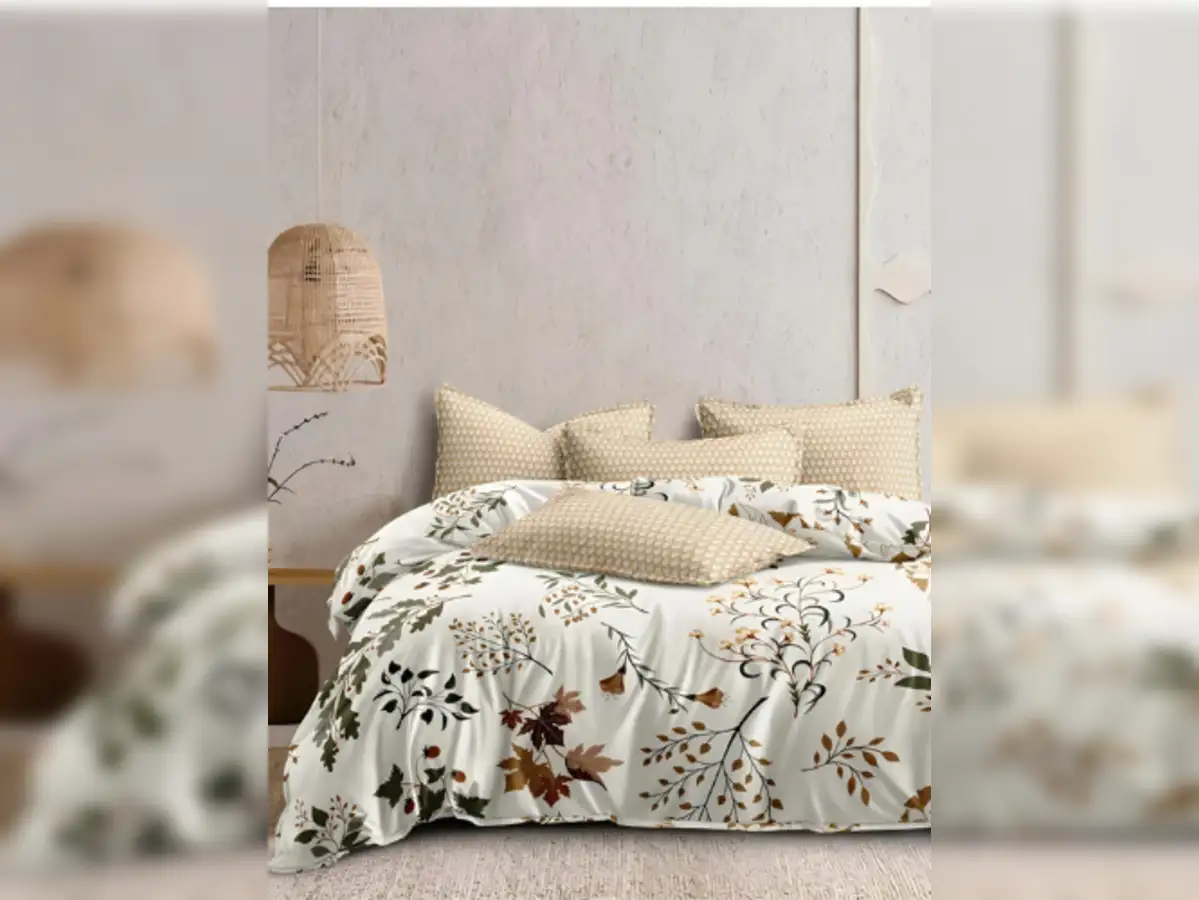 Buy Now The RRC Cream-Coloured Floral Polycotton 4 Pieces Double King Regular Bedding Set blends comfort and elegance with its soothing cream shade and beautifully detailed floral and leafy designs. Made from soft microfiber cotton, this king bedding set includes a spacious bedsheet, two matching pillow covers, and a cozy dohar, perfect for mild winter use. Its breathable, easy-care fabric ensures everyday comfort, while the charming print makes it an attractive floral bedding set to elevate your bedroom decor effortlessly. Specifications: