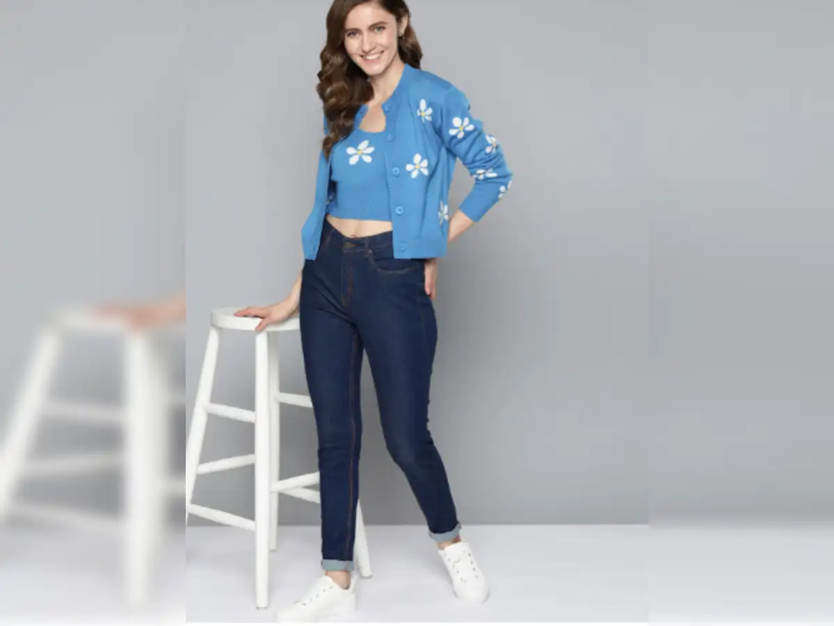Buy Now The Mast & Harbour Women Blue & White Floral Printed Cardigan with Top offers a stylish two-piece set perfect for chic winter layering. The bright blue cardigan features a simple and beautiful white floral print, a round neck, long sleeves, button closure, and a ribbed hem for a neat finish. Paired with a matching cropped cami top with delicate spaghetti straps, this set stands out as one of the best cardigans for women who love coordinated outfits. Its fresh colour and modern silhouette make it a truly trendy cardigan ideal for casual outings and everyday wear.