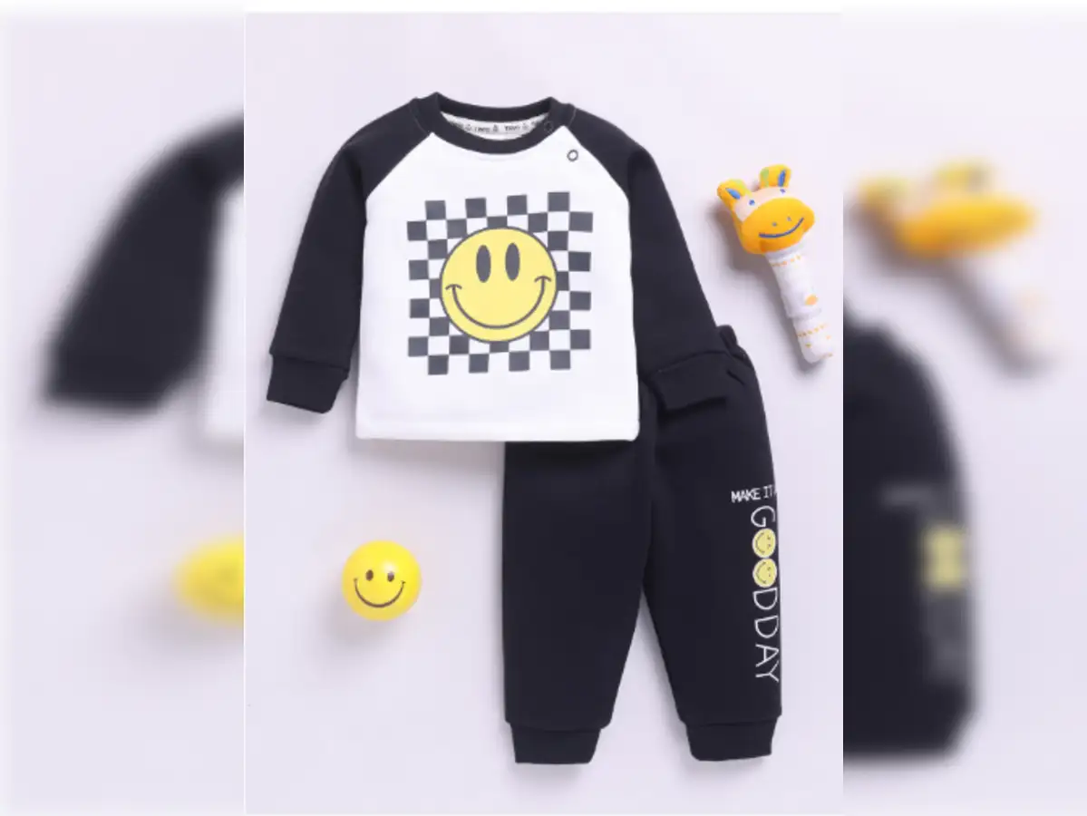 Buy Now The YK X Tinyo Infant Boys Smiley Printed Fleece T-shirt with Joggers is a cozy and stylish newborn winter wear set designed to keep your little one warm and comfortable during cooler days. This adorable set includes a full-sleeve printed T-shirt and matching joggers, making it one of the best winter sets for babies. The white and black T-shirt features a cheerful smiley face print and a round neck with button detailing at the neck for easy wearing. Paired with black joggers printed with the positive text “Make it a good day,” the set offers both comfort and cuteness.
