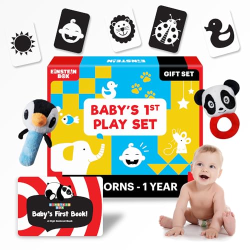 Give your little one a head start with the Einstein Box Gift Set, designed for babies aged 0-12 months! This scientifically crafted set stimulates visual and auditory senses, aiding brain development through high-contrast flashcards, a sensory-rich book, and engaging rattles. The black-and-white flashcards boost eyesight and cognitive skills, while the rattle toys enhance motor coordination and auditory perception. A high-contrast board book introduces patterns and shapes in a way newborns can recognize.