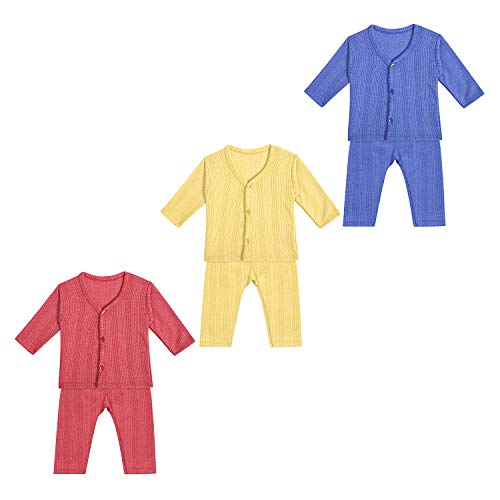 Tiny Tooth Cotton Blend Front Open Thermal Pajama Set (Top & Bottom) For Baby Boys & Baby Girls, Pack Of 3 Sets - Body Warmer For Baby (0-3 Months) (0-3 Months), Multicolour